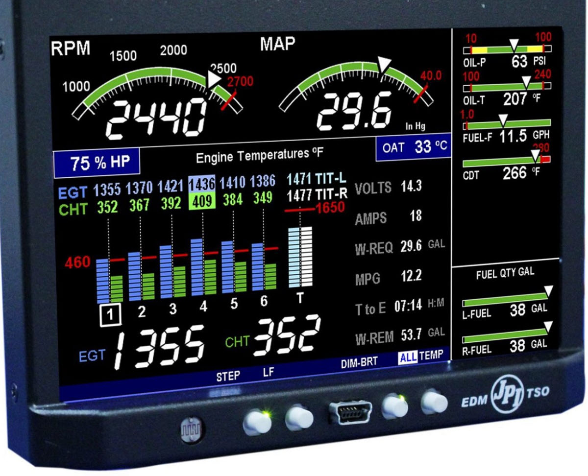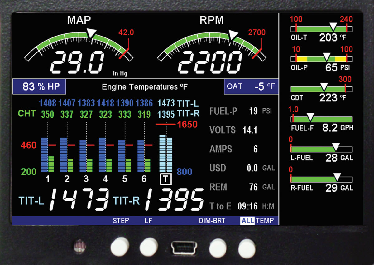 - Oil temperature, oil pressure, fuel pressure, electrical system voltage/amps, manifold pressure, outside air temperature, fuel flow, remaining fuel monitoring, and more (depending on how equipped).
